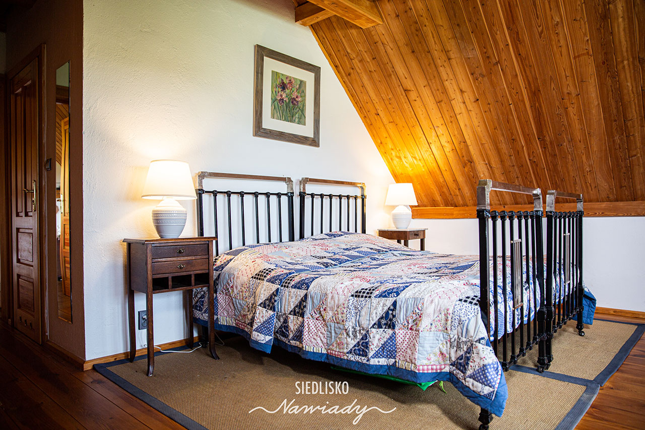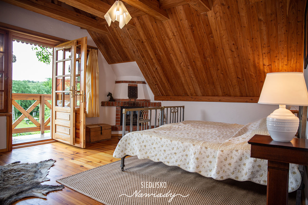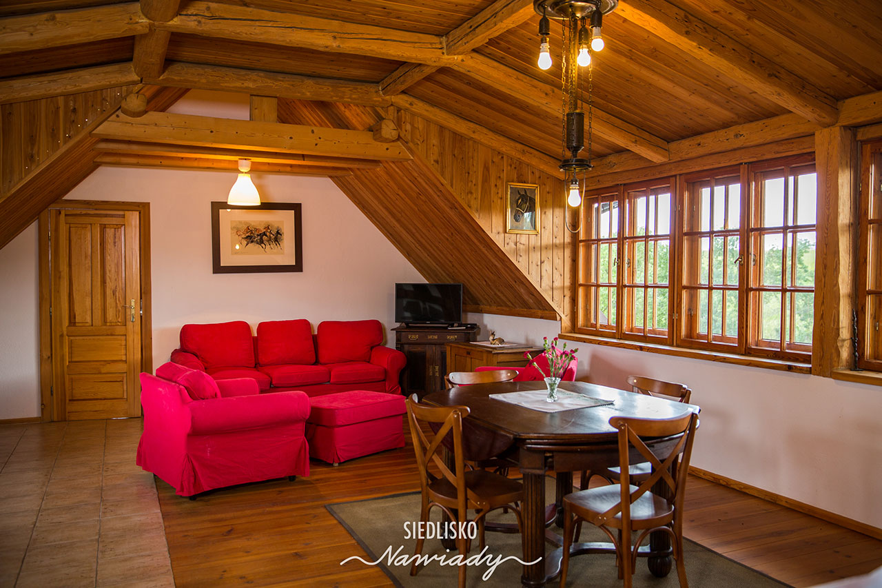 Apartament składa się z 2 dużych pokoi z łazienkami oraz salonu z aneksem kuchennym, miejscem do wypoczynku i jadalni. W salonie i w pokojach są kominki. Wyposażony jest w TV, minibar i sejf. W kuchni jest pełne wyposażenie wraz z pralką, zmywarką i lodówką. Jedna sypialnia ma malowniczy widok na jezioro, druga na ogród i gniazdo bociana, a salon na ogród i łąki z końmi.