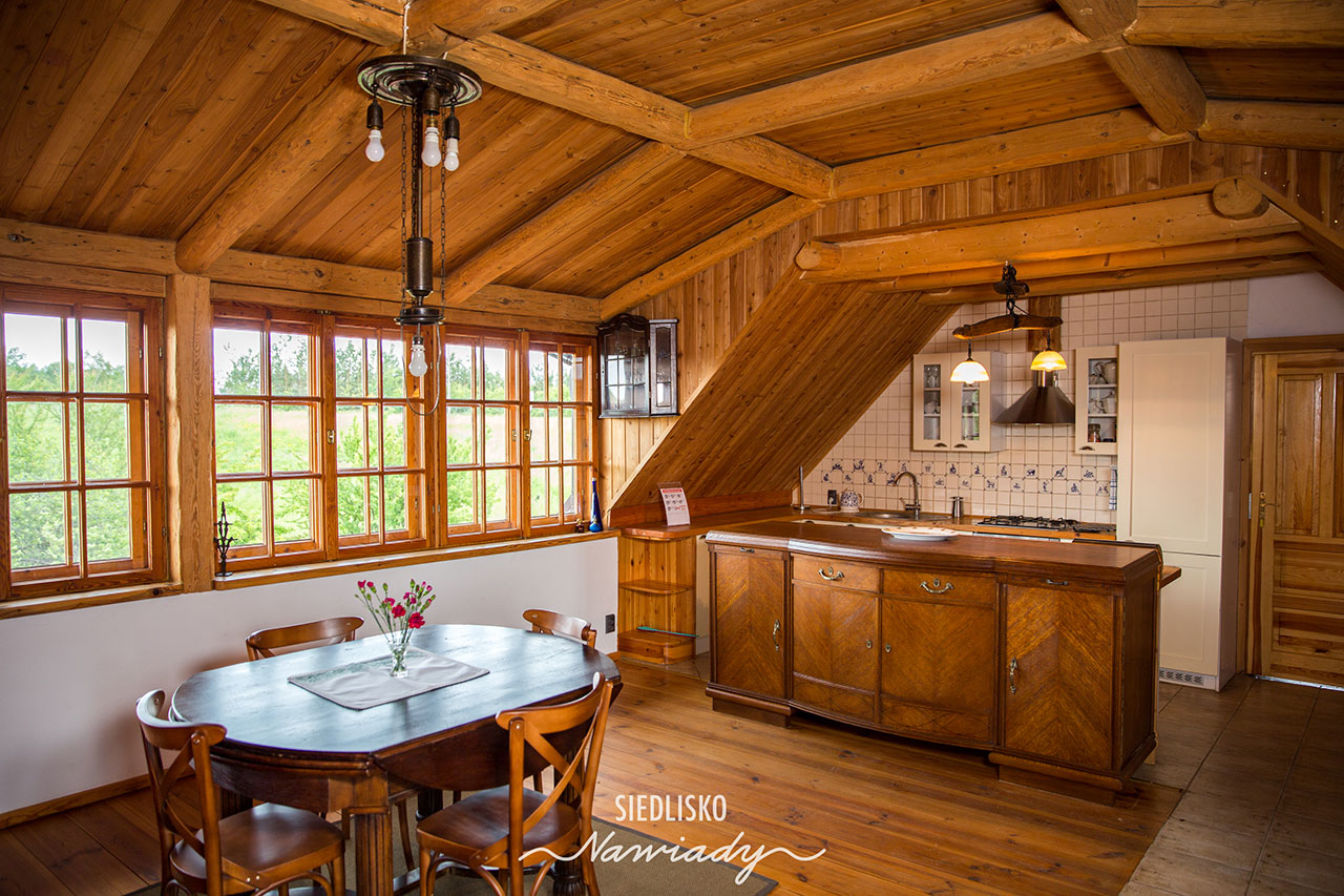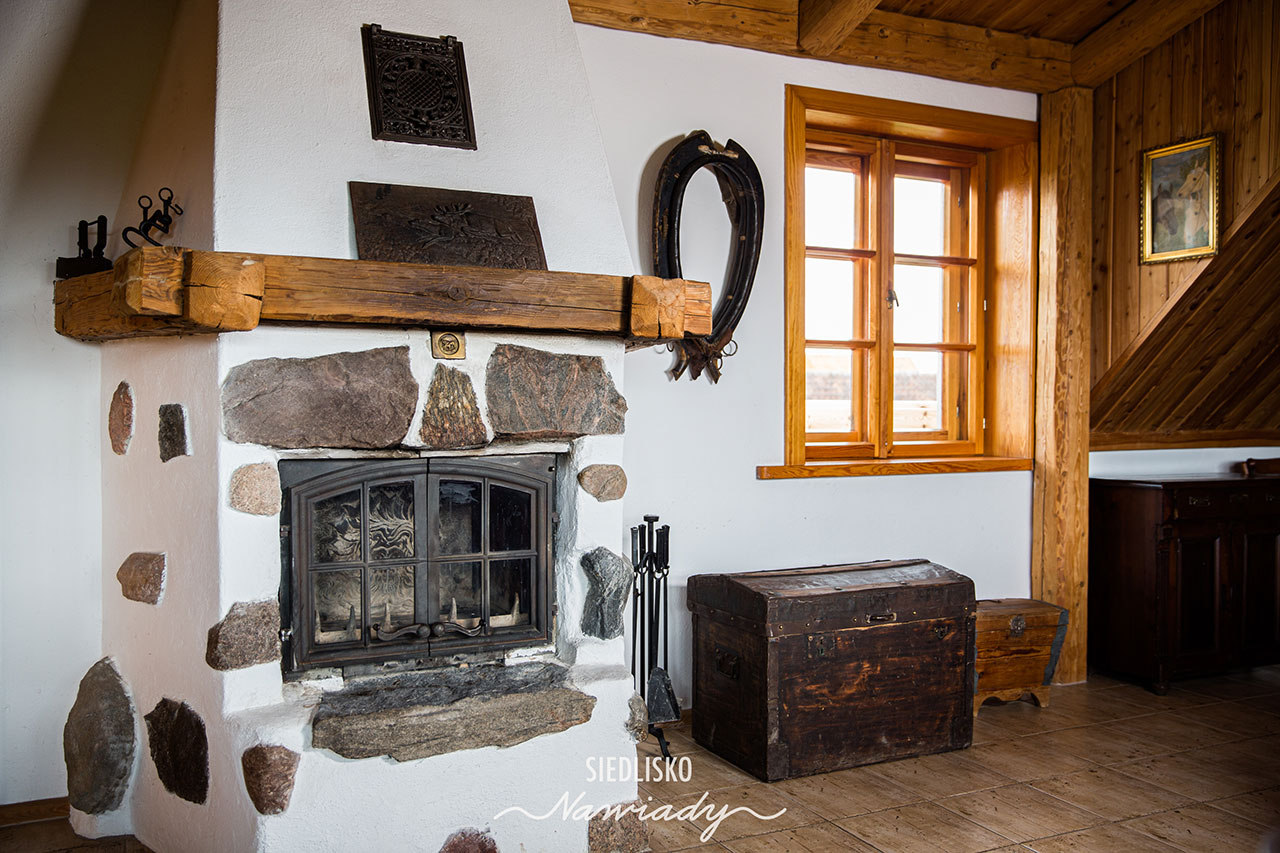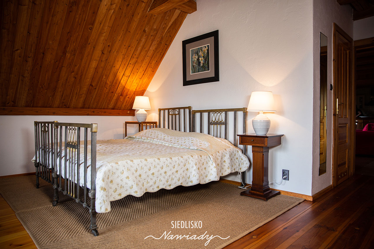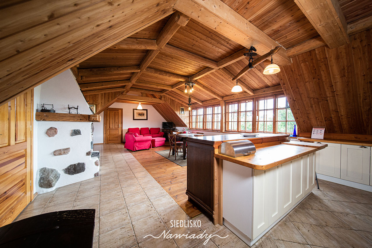 Apartament składa się z 2 dużych pokoi z łazienkami oraz salonu z aneksem kuchennym, miejscem do wypoczynku i jadalni. W salonie i w pokojach są kominki. Wyposażony jest w TV, minibar i sejf. W kuchni jest pełne wyposażenie wraz z pralką, zmywarką i lodówką. Jedna sypialnia ma malowniczy widok na jezioro, druga na ogród i gniazdo bociana, a salon na ogród i łąki z końmi.